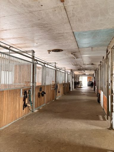 Außerdem gibt eine abschließbare Sattelkammer, eine Box mit privaten Sattelschränken, Deckenhalter sowie Platz für Futter.