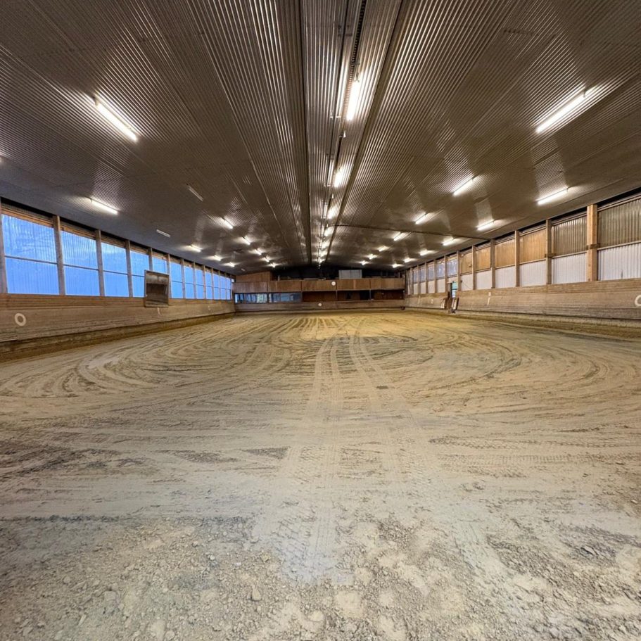 Unsere Reithalle hat die Turniermaße von 20 m Breite und 40 m Länge. Breite Lichtbänder an den Längsseiten und an einer Stirnseite sorgen für eine helle Atmosphäre in der Halle. In Zeiten in denen nicht ausreichend Tageslicht einfällt kann die Halle durch LED-Leuchten gleichmäßig ausgeleuchtet werden.